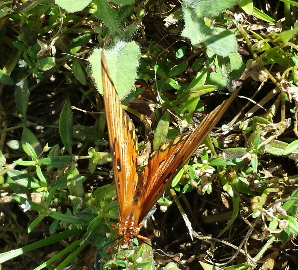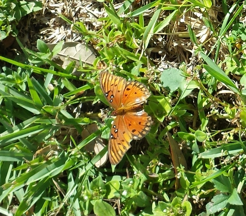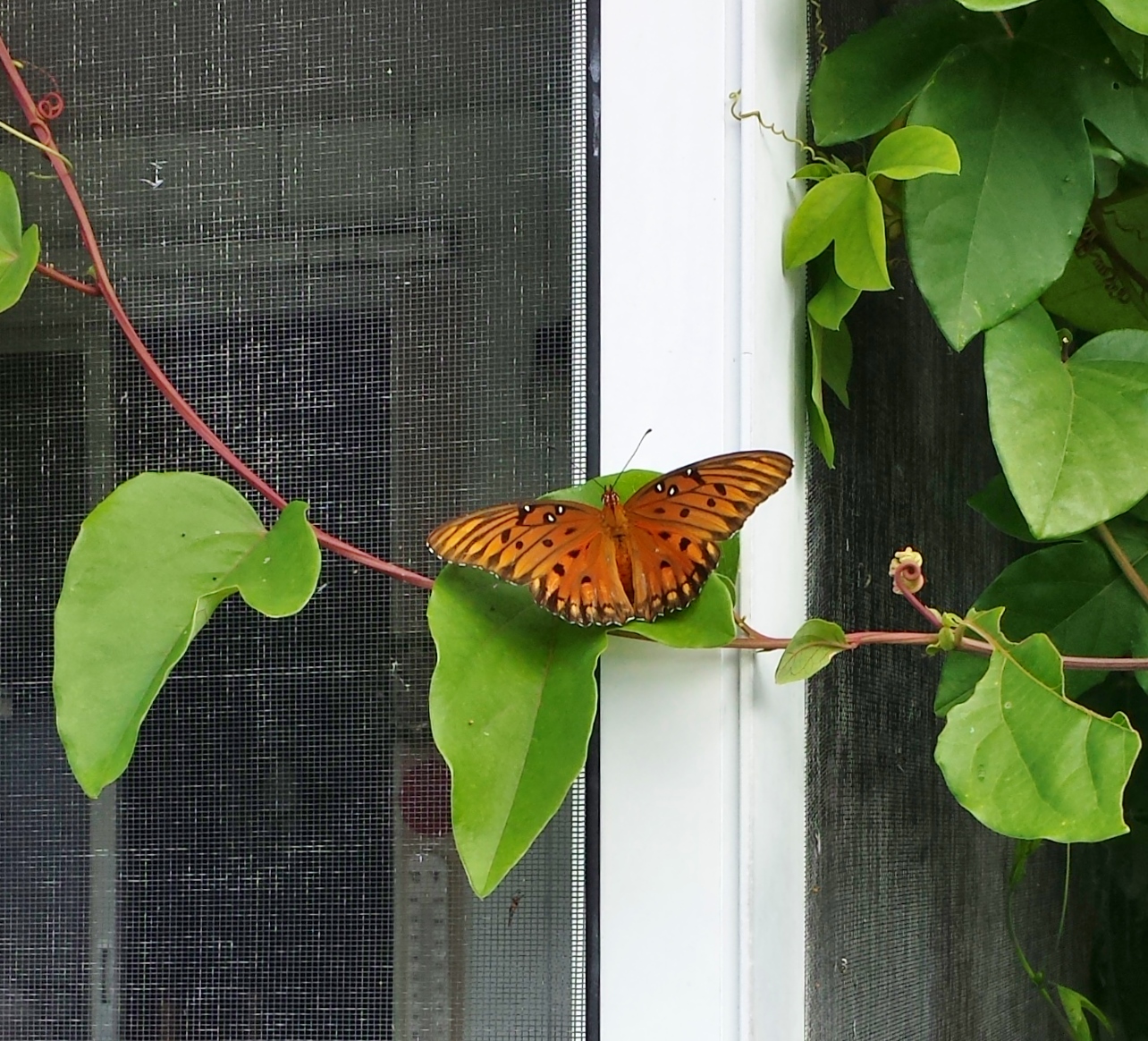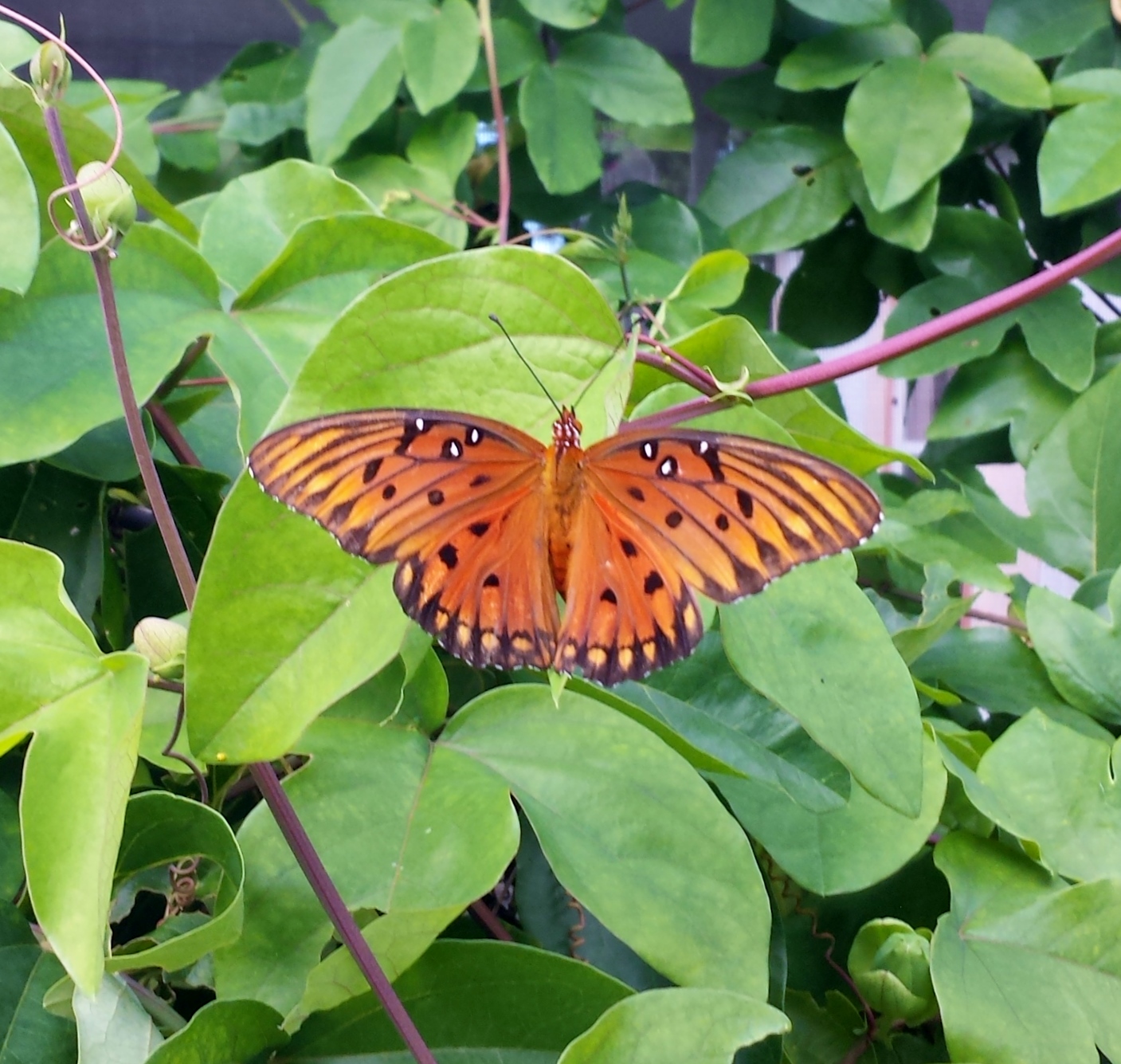 I was so sad that the caterpillars had destroyed such a beautiful, healthy plant, a plant that I really love. I have been feeding and nurturing it again, but I don’t think it’s going to recover. Although a few leaves remain, the twisted vines are brown and withered. I went out there today and a large butterfly flew around me and I instantly recognized it from the research I had done on the caterpillars.