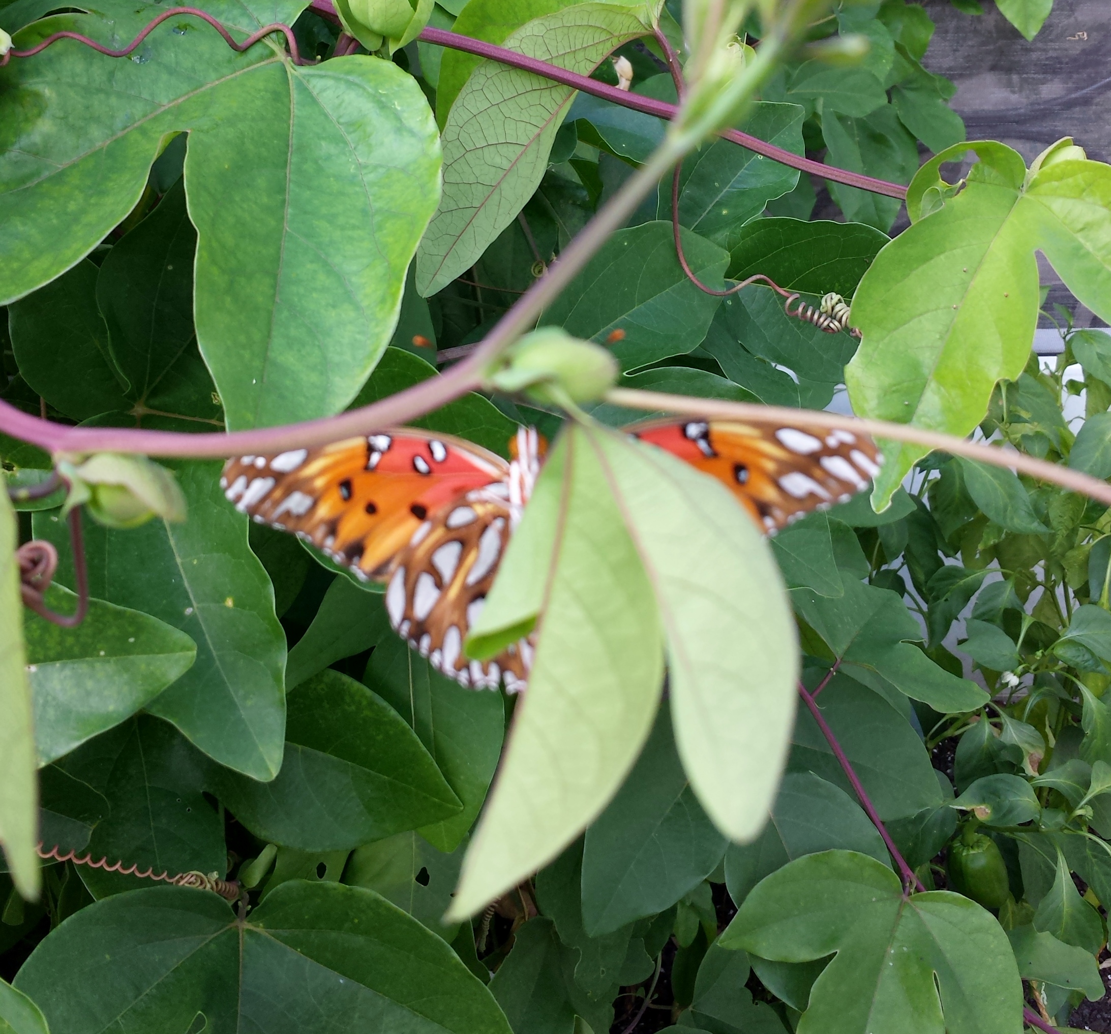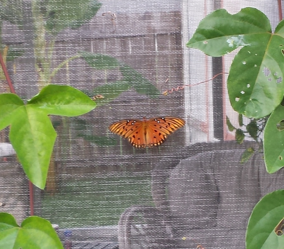 It wouldn’t hold still for pictures but it actually let me hold it and it stayed in my hand for a minute. It was pretty, but I wanted my plant back. I told the one returnee that it better not be dropping off more babies, but it seemed to have a devil may care attitude and it didn’t show any remorse for having killed the Dutchman’s Pipe. I am going to try to find another Dutchman’s Pipe to plant but I don’t know if I can protect it from these ravenous creatures. It flew around my Ivy plant, which also has vines and checked it out for a while. I don’t think so. That plant is coming back in the house.