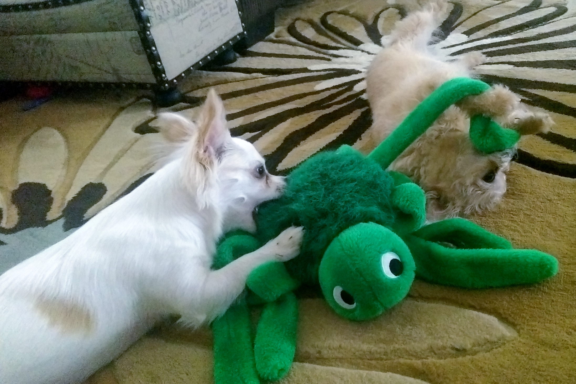 Ms. Kita is thrilled to have another Chihuahua to run with and is happily sharing her toys. Happy about sharing her Mommy and Daddy? Not so much.