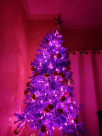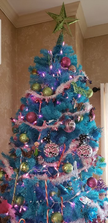 After they were all gone, I brought out some of my little fairies, my mom’s butterflies and a few special ornaments. I added them to the tree. The tree lights are pink and at night, it changes the tree’s color and the walls around it glow.